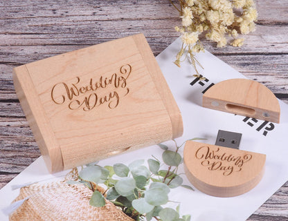 Coffret et clé USB « Ronde » en bois d'érable personnalisable avec gravure laser (coffret + clé) de logos et textes pour particuliers, photographes, promotions et cadeaux d'entreprises.