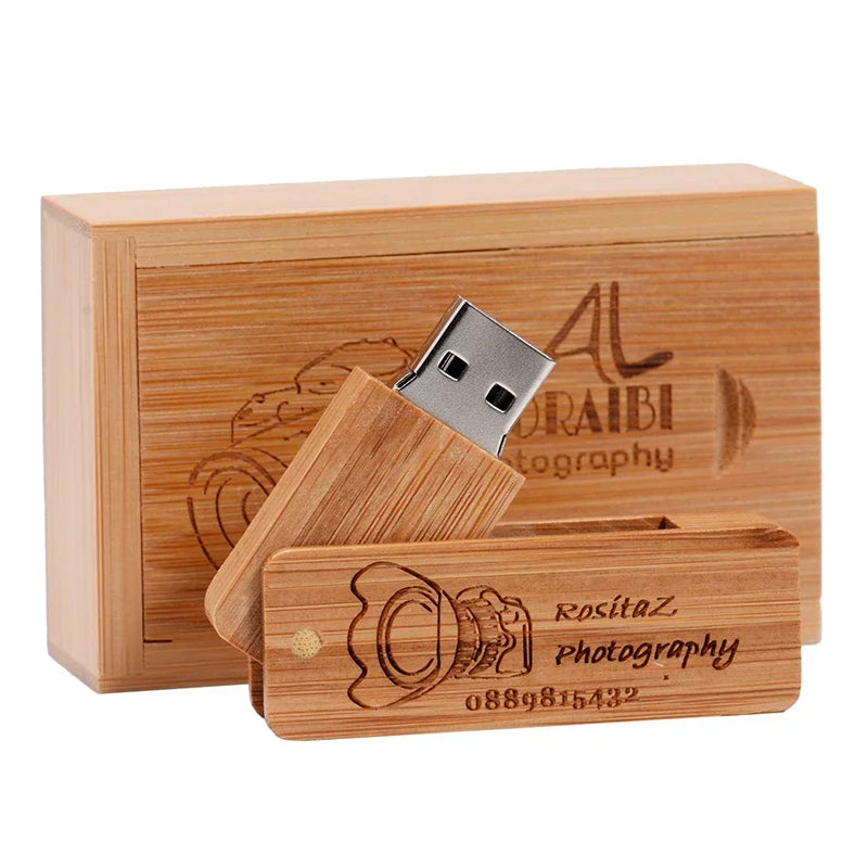 Coffret et clé USB pliable « Rectangle » en bois personnalisable avec gravure laser (coffret + clé) de logos et textes pour particuliers, photographes, promotions et cadeaux d'entreprises.
