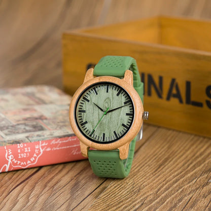 Très jolie montre à Quartz en bambou naturel avec son bracelet en silicone vert.